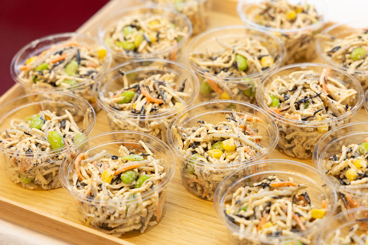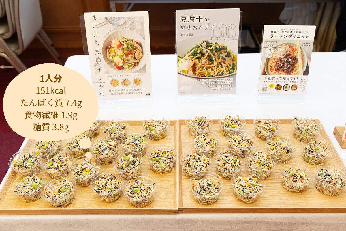 試食の「豆腐干、ひじき、ごぼうのデリ風サラダ」。たんぱく質や鉄がしっかりとれる!