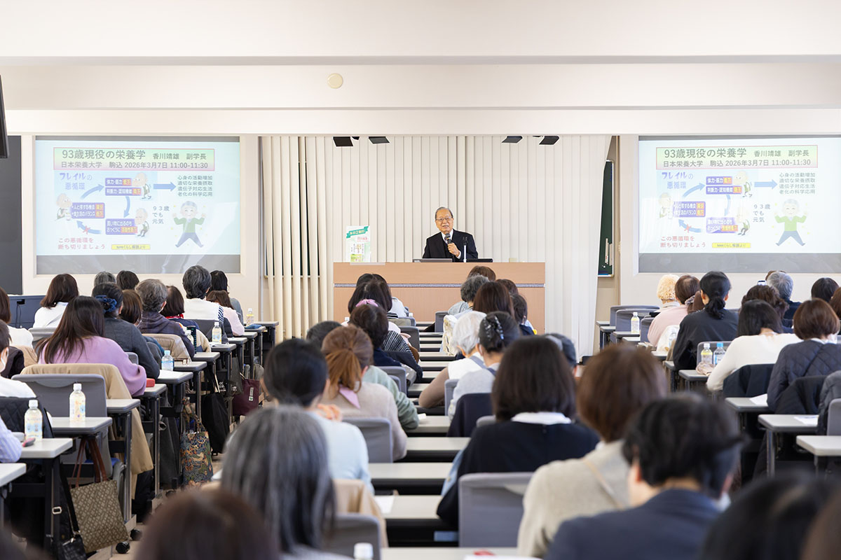 『92歳、栄養学者。ただの長生きではありません!』の著者でもある香川靖雄副学長は、現在93歳。生涯現役のための自身の健康法や、埼玉県坂戸市で実践している「遺伝子対応栄養指導」の実績、また最近の老化研究などについて、データを交えて紹介しました。