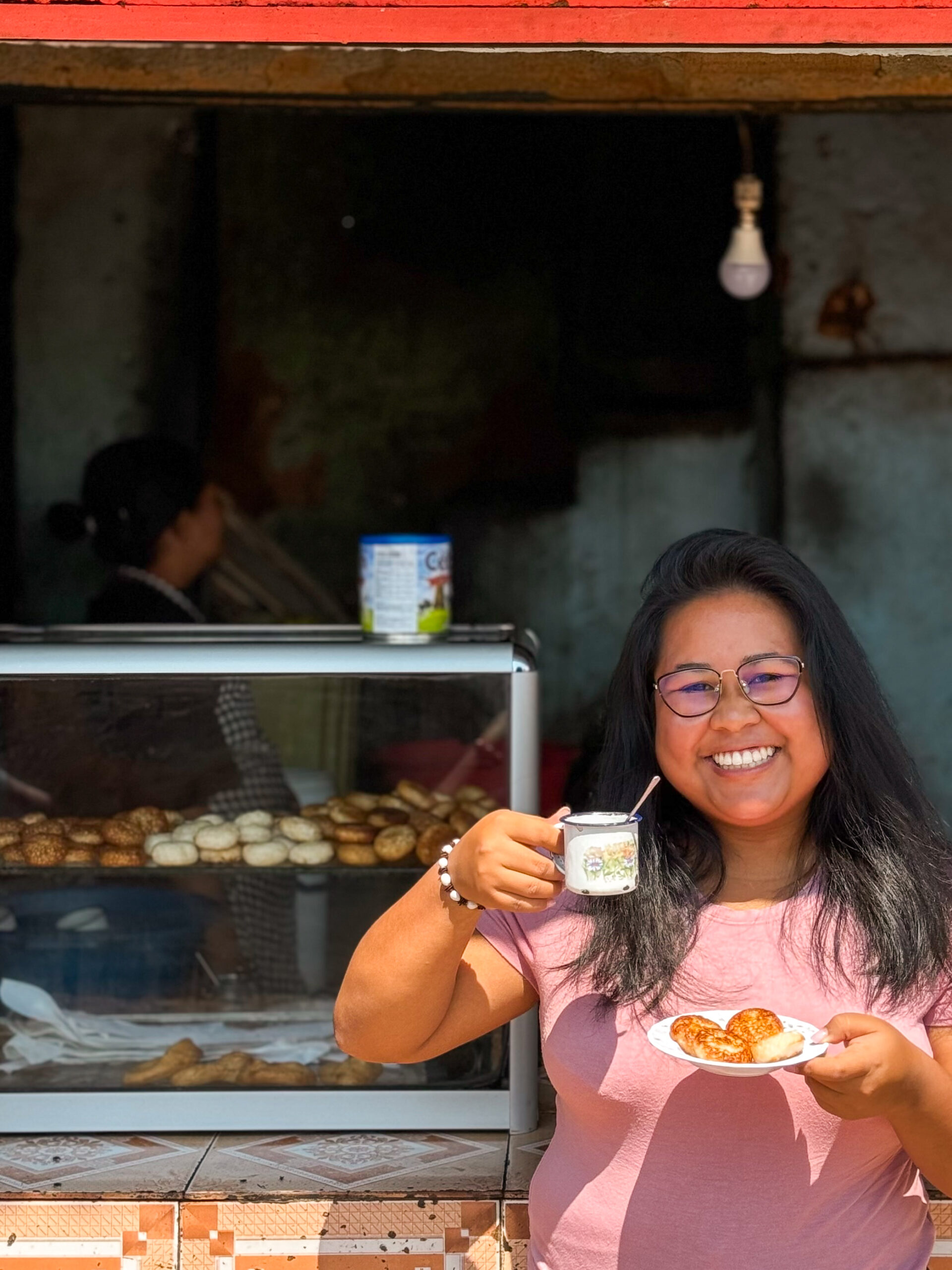 素敵な笑顔のミミーさん。/この日の朝食、マダガスカルドーナツとコーヒー。/朝はいつもコーヒーかお茶が多いというマダガスカル人の朝食ですが、今回はドーナツに合うブラックコーヒーを選んだとのこと。