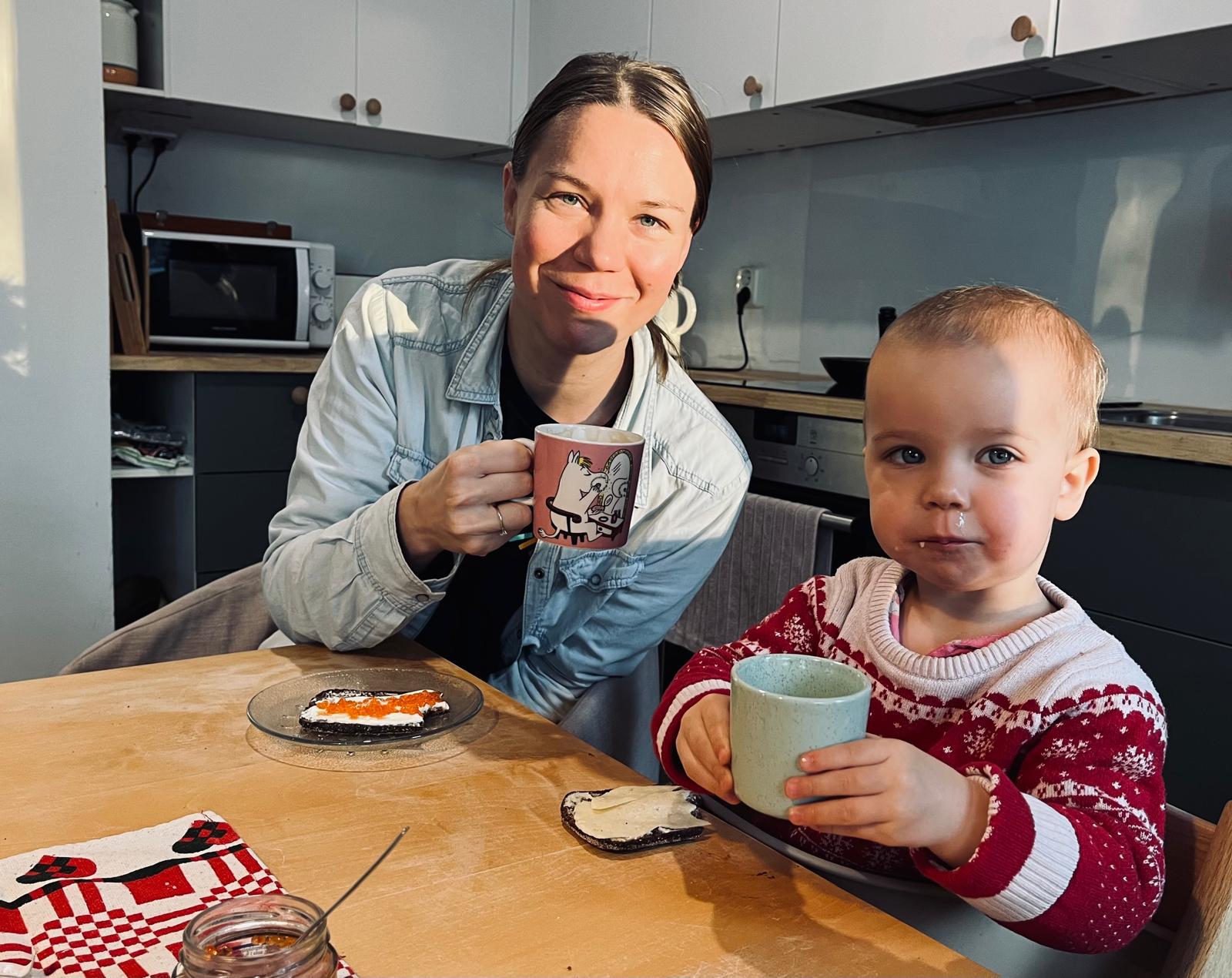 〈左〉サラさんと2歳の娘シャーロットちゃんがムーミンマグで朝食コーヒーを楽しむ様子。ライ麦パンとチーズも一緒に。シャーロットちゃんのドリンク「ベイビーチーノ」は、温かいミルクにココアパウダーを少し振りかけたもの。〈右〉さまざまなデザインがあるムーミンマグ。