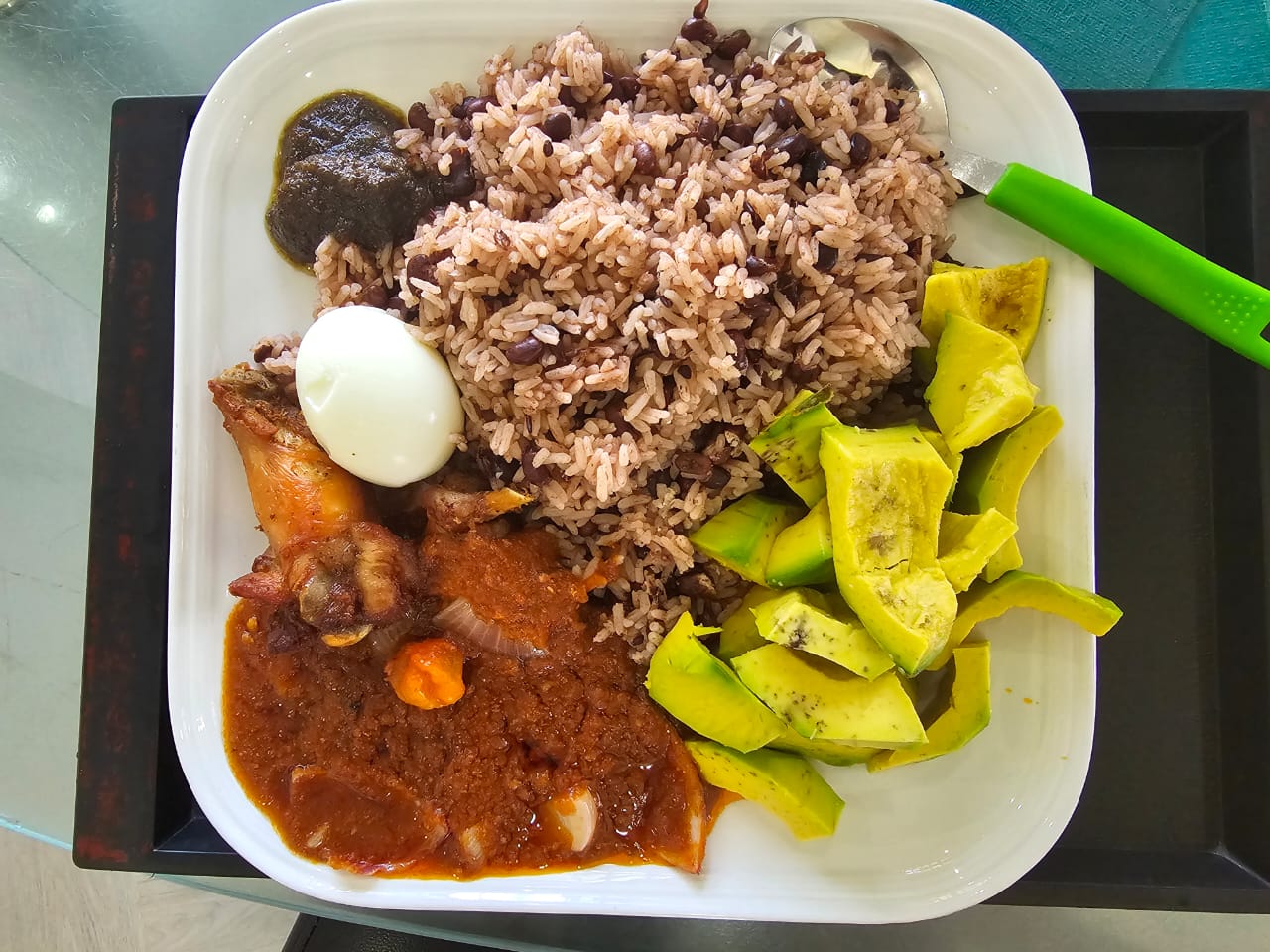 彼の朝食は、ガーナで最も人気のある料理の1つ、「ワチェ(Waakye)」です。