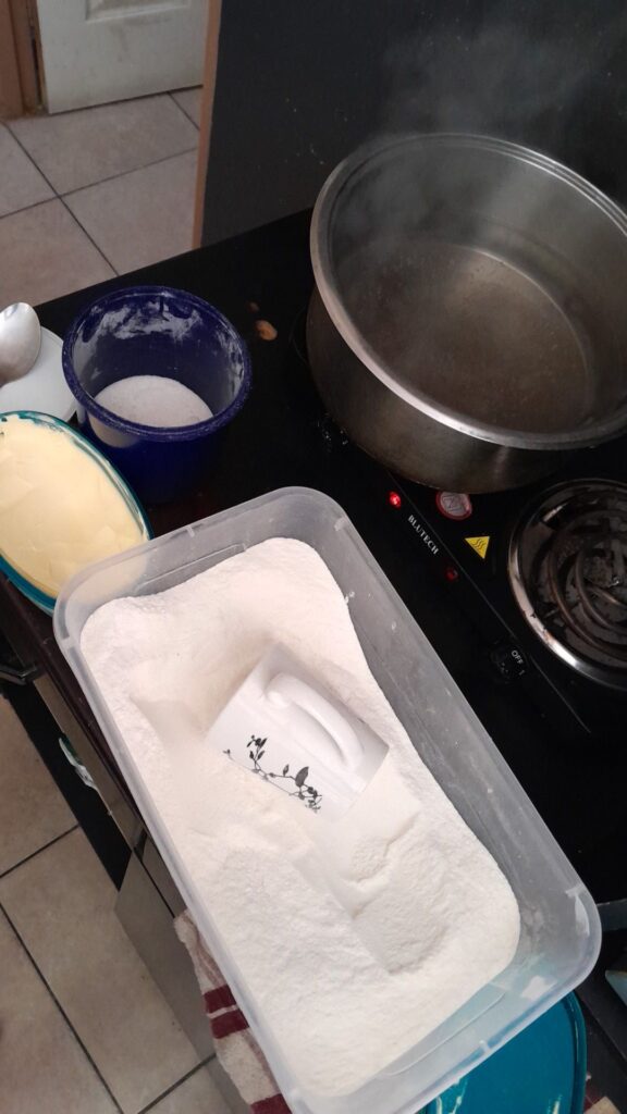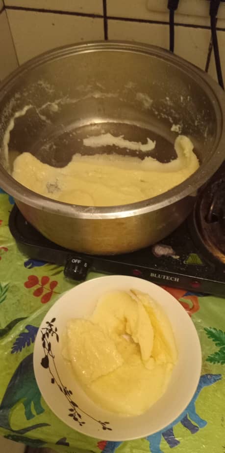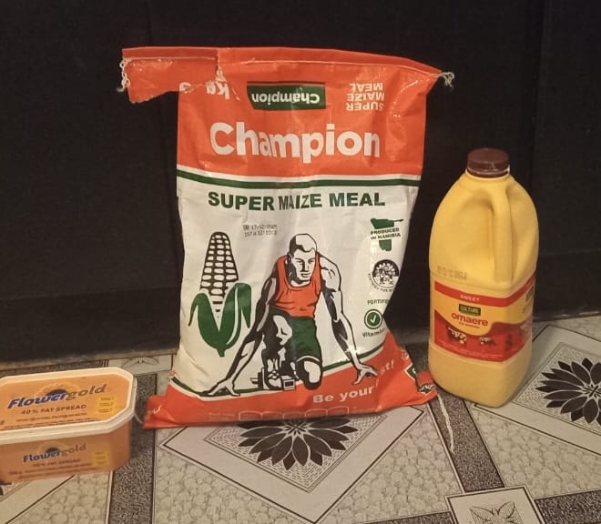 彼の朝食は「オシフィマ」と呼ばれるとうもろこしがゆです。とうもろこし粉、バター、塩、ナミビアの伝統食品ともいえる発酵バターミルク(オマエレ)を加えたもので、ときにはエネルギー補給のためブラウンシュガーを加えることもあります。