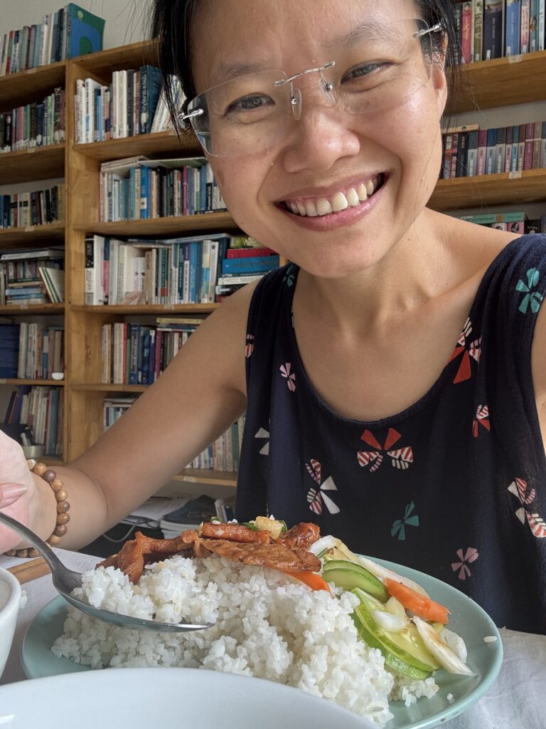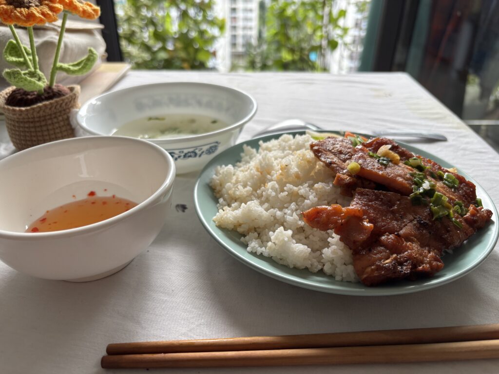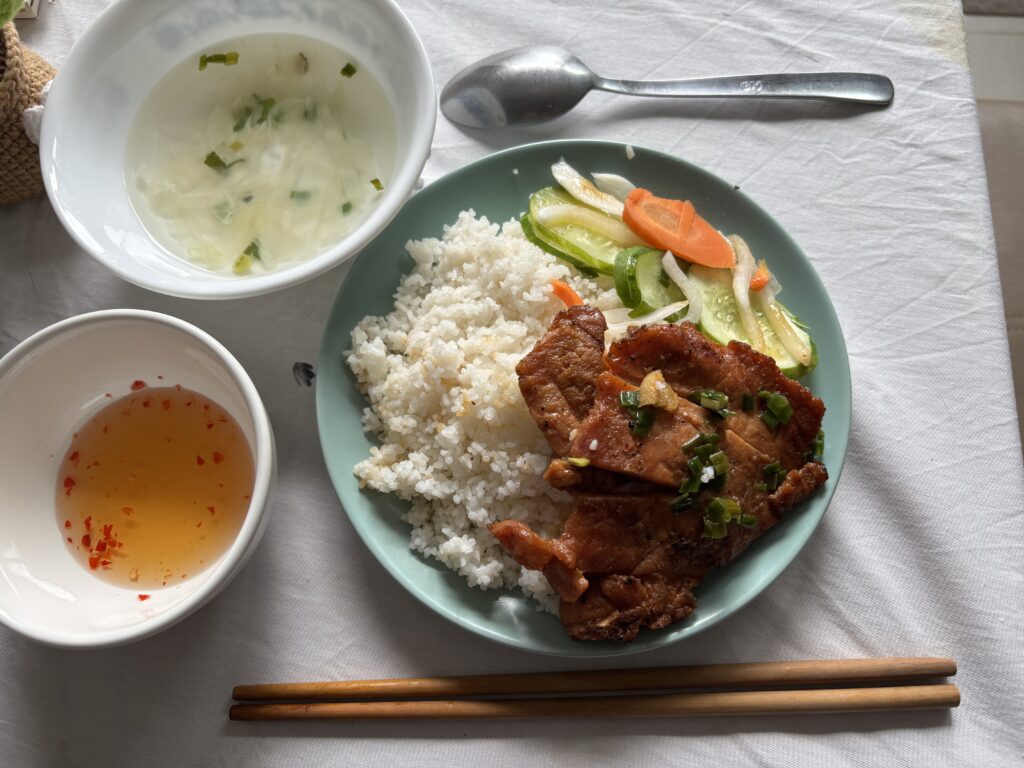 食べるときは、ごはんにソースをかけ、豚肉を切り分け、すべてを混ぜ合わせてから口に入れます。その味わいには、調和・共有・満足感をたいせつにするベトナムの食文化が表われているように感じられます。