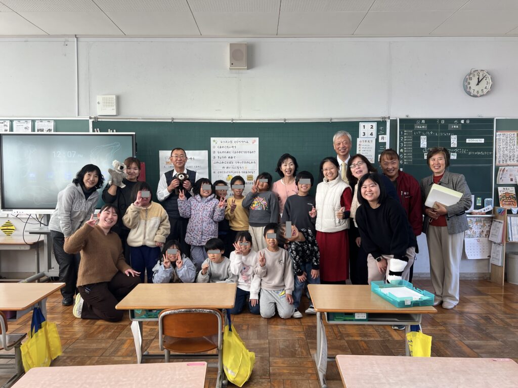 日本SEL学会のつながりで日本の学校訪問をするアンさん(白いダウンベストを着用)。