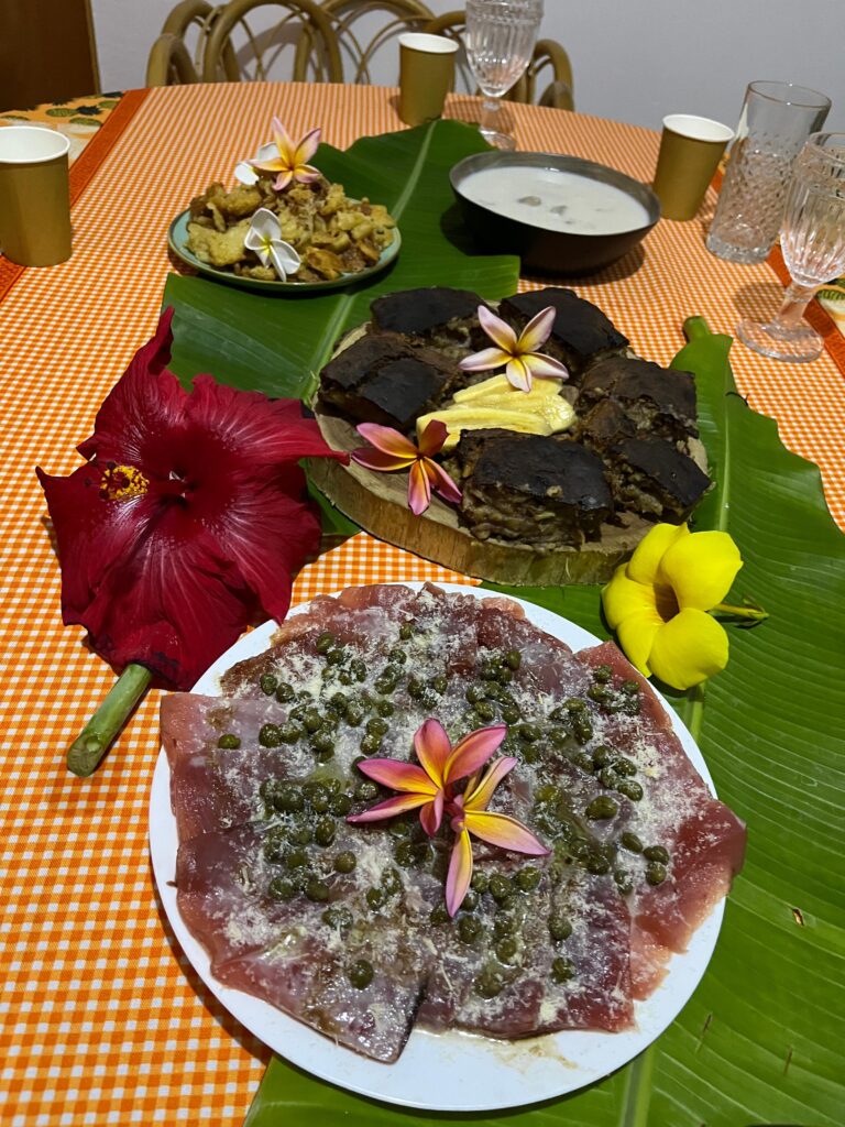 採れたてのマグロをさばいて、レモン、塩、ケッパー、パルメザンチーズを添えて食べます。 色鮮やかでつい手を伸ばしたくなるこの料理ですが、特別な名前はないそうです。すべてに名前をつけなくてもいい、そんなおおらかな島の感覚が表われているのかもしれません。