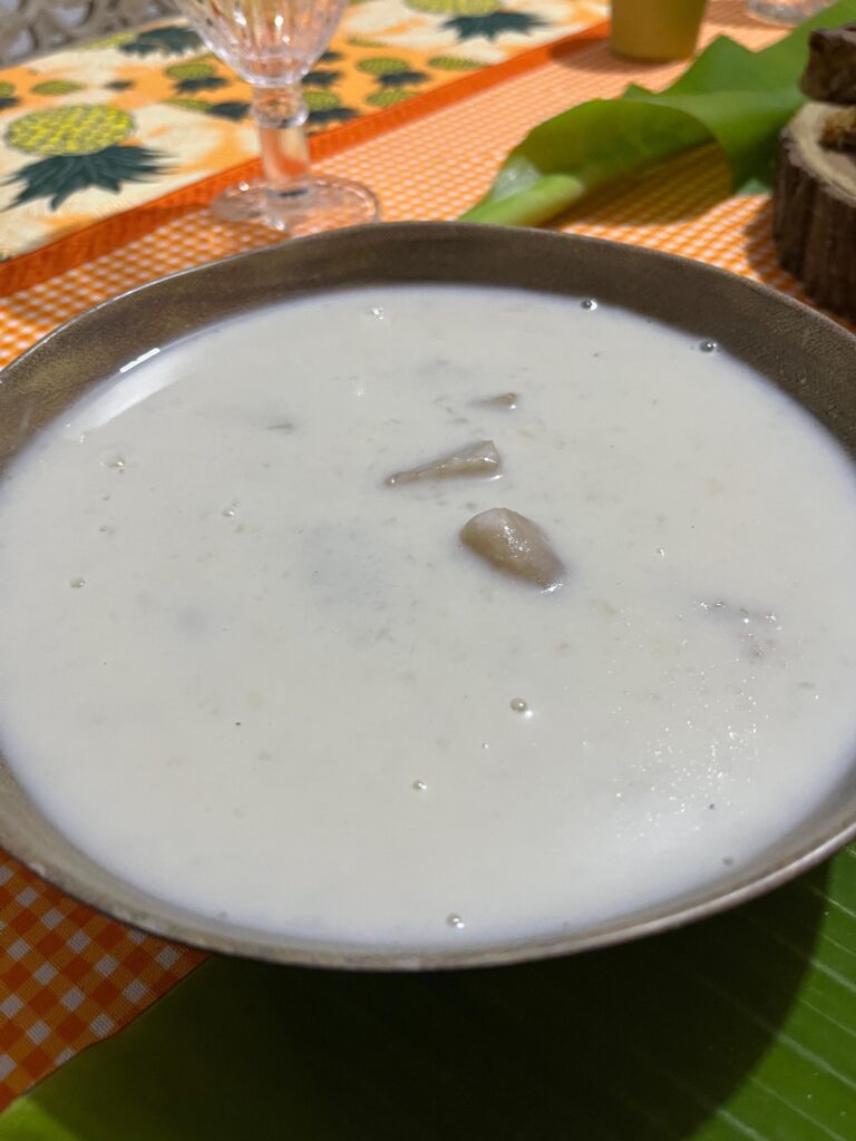 作り方は、まずタロイモの皮をむき、ゆでます。とけ出してくるでんぷんをこまめにとり除き、イモに火が通ったところで牛乳を加えます。煮たオートミールに食感が似ていて、やさしく、ほんのりとした甘味が感じられます。