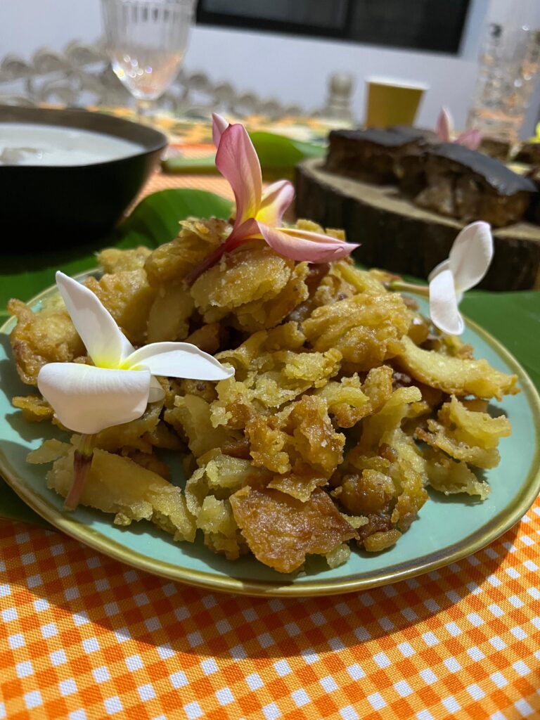 写真に映る花々は、自然がつねに暮らしの近くにあることを表わしています。食卓を花で飾るのは、島ではごく自然な習慣。そして、テーブルにはバナナの葉を敷きます。島ではバナナの葉をお皿のように使うのが一般的で、魚料理や肉のグリルなどもバナナ葉の上に盛りつけられます。