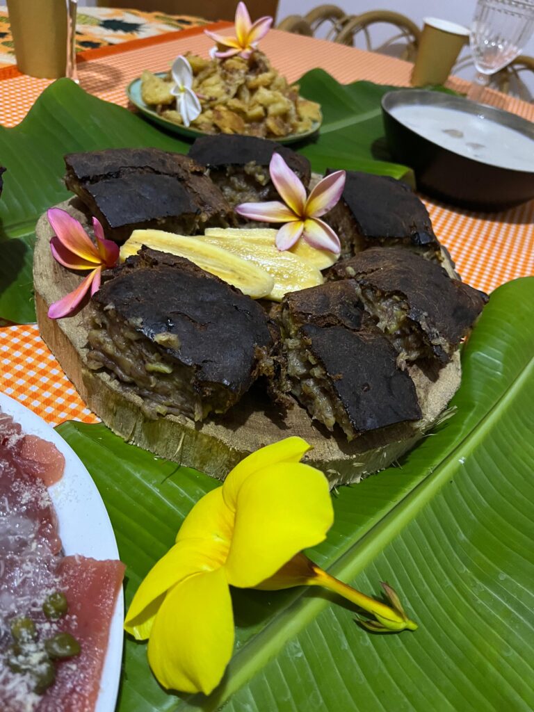 特にバナナを使ったポエは、チリ本土で「コレヒアル(colegial)」と呼ばれるパンプディングに似ています。ポエは、甘くもしょっぱくもできる島の伝統的な料理ですが、今回は黒バナナ、小麦粉、牛乳、油、砂糖を使って甘く作られ、やわらかく満足感のある仕上がりでした。