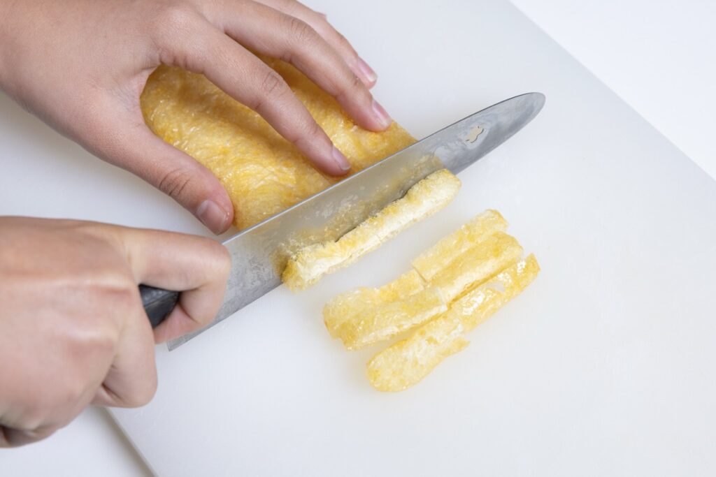2 油揚げは短辺を2等分してから1cm幅に切る。