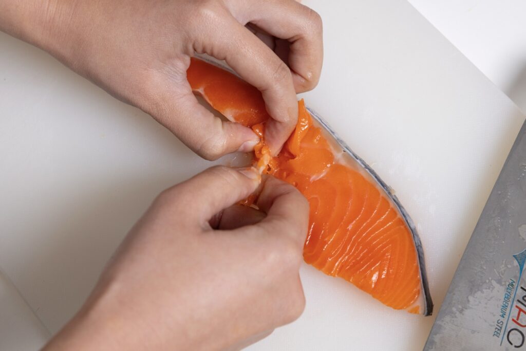1 サケの切り身は皮と骨を除き、一口大に切る。