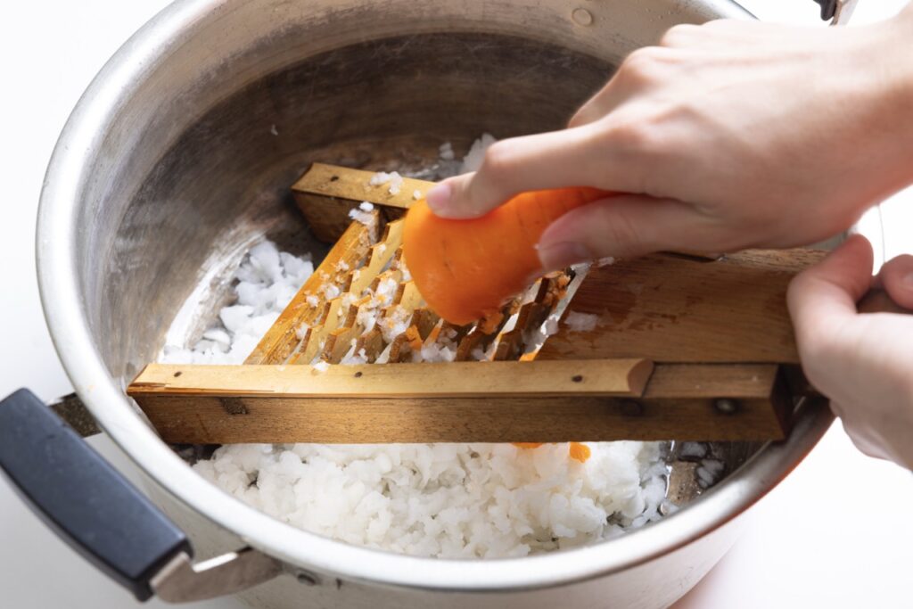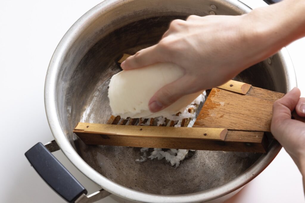 3 大根とにんじんは洗い、鬼おろしを使って皮つきのままなべの中にすりおろす。小さく残った部分は包丁でみじん切りにする。