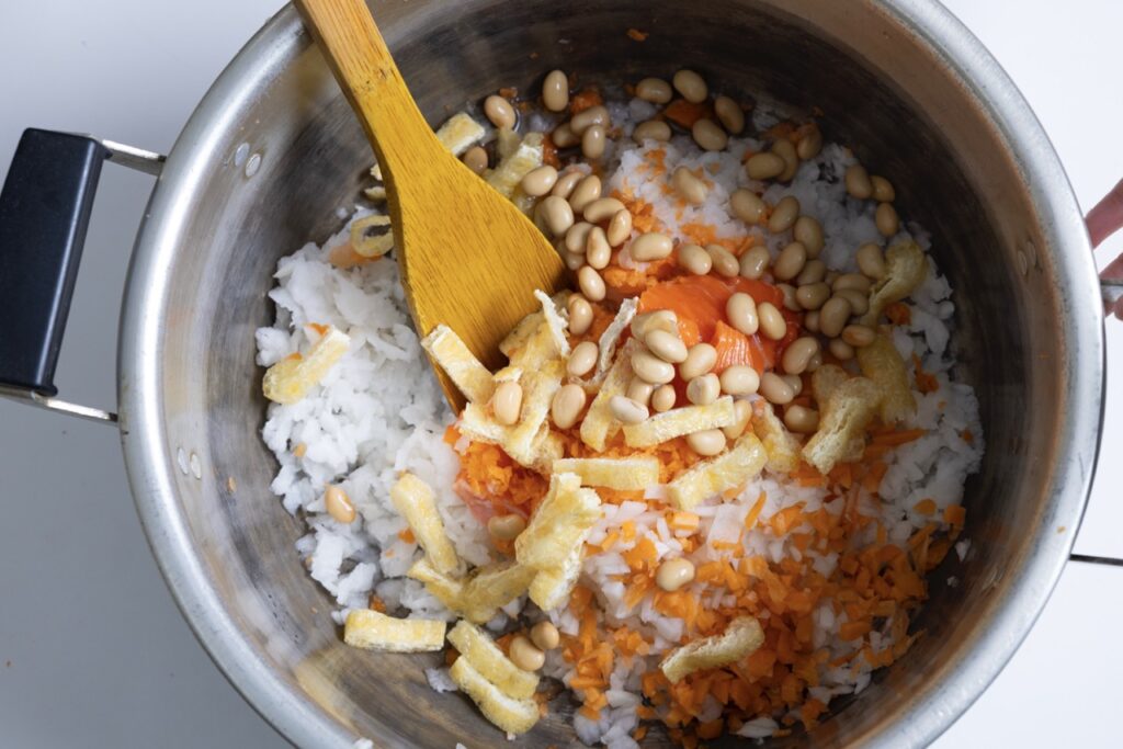 4 サケ、油揚げ、大豆の水煮を加え、中火にかける。