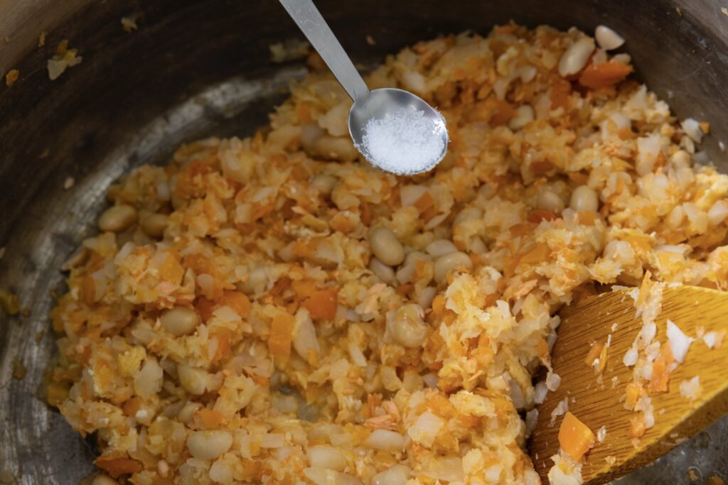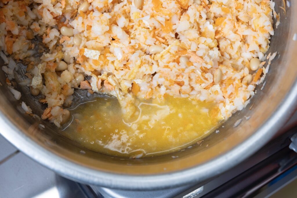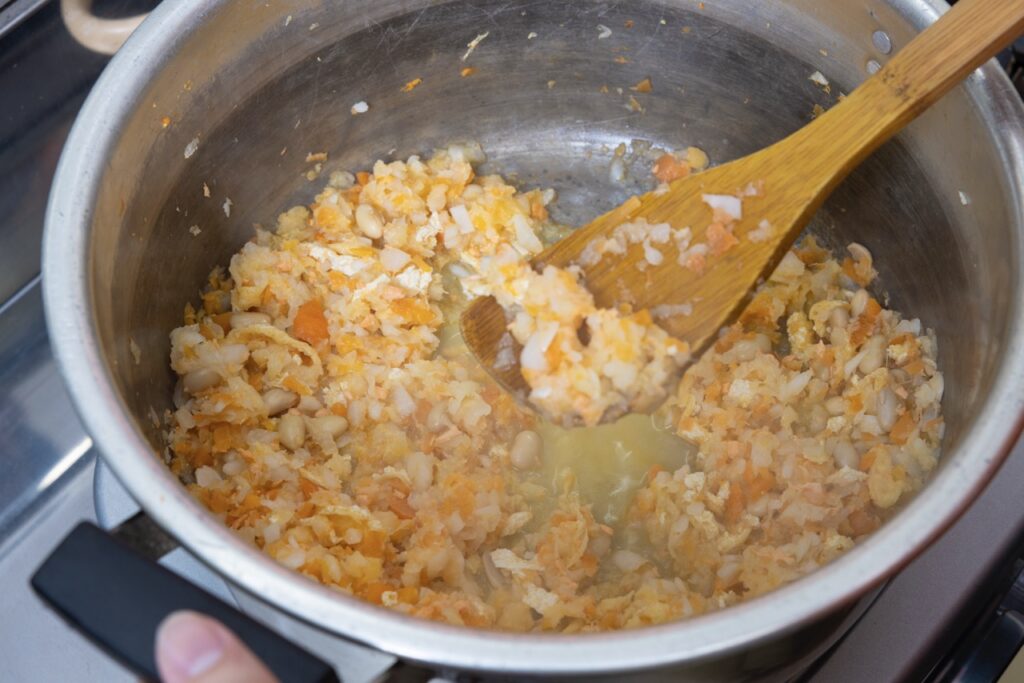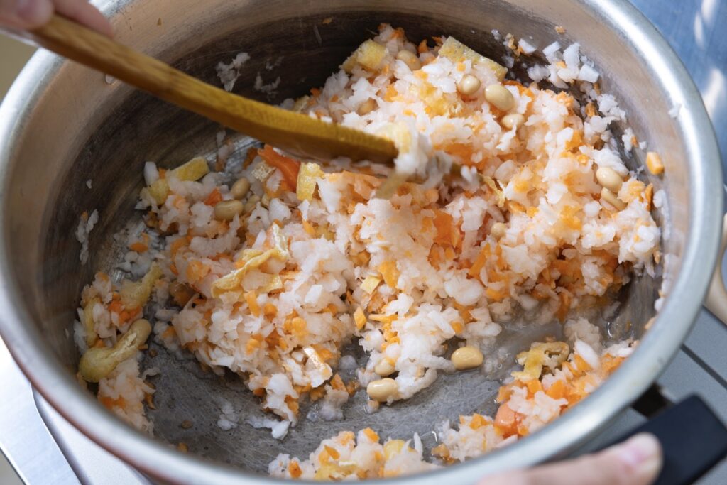 5 焦げつかないよう木べらでよく混ぜながら野菜がしんなりとなるまで20分ほど煮る。