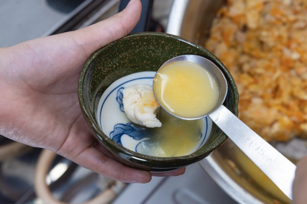7 なべの煮汁を少しとり分けて酒粕に加え、均一になるまでよく混ぜてとかす。