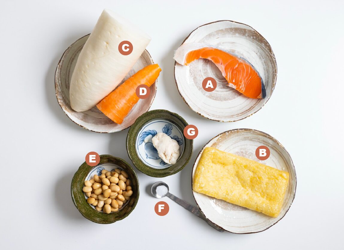 無塩のサケの切り身と酒粕、調味の仕上げにうま味調味料を活用。塩分を控えても味のバランスを保ち、”おいしい減塩”が実現できた。