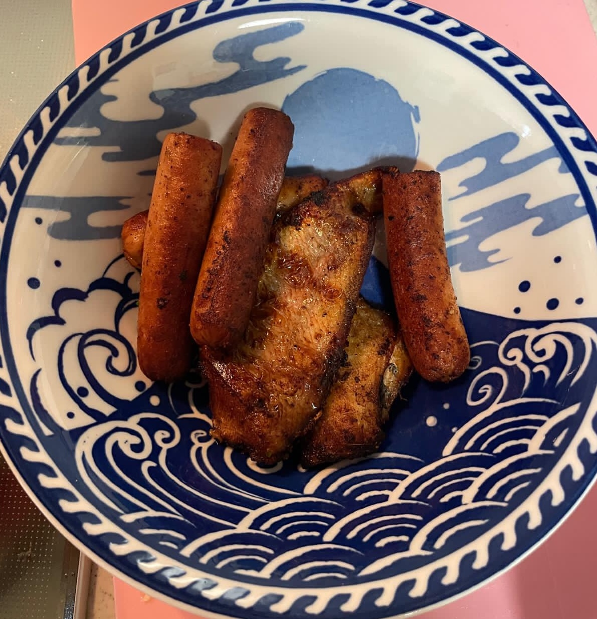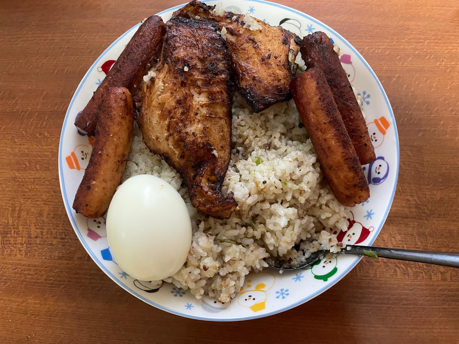 少し粘りけがありながらもしっかりとした食べごたえ。そこにフライにしたスナッパー(熱帯の海の魚)、ソーセージ、ゆで卵を添えるのが定番です。