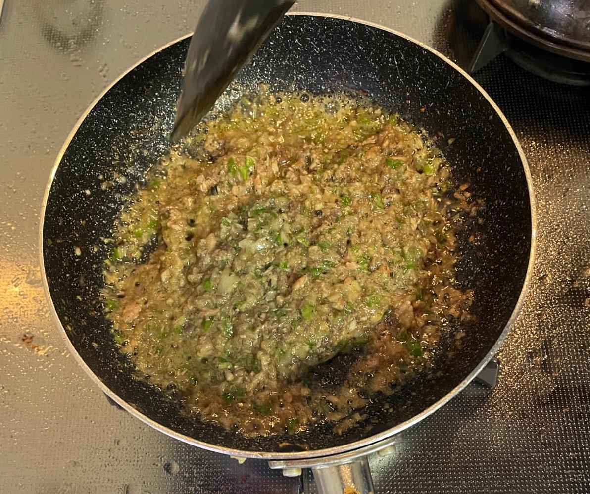 まずオクラをやわらかくなるまでゆで、別のなべで玉ねぎ、とうがらし、トマトを油でいため、さらにイワシを加えてコクのあるソースを作ります。そこにオクラを混ぜ合わせ、最後にごはんと合わせます。