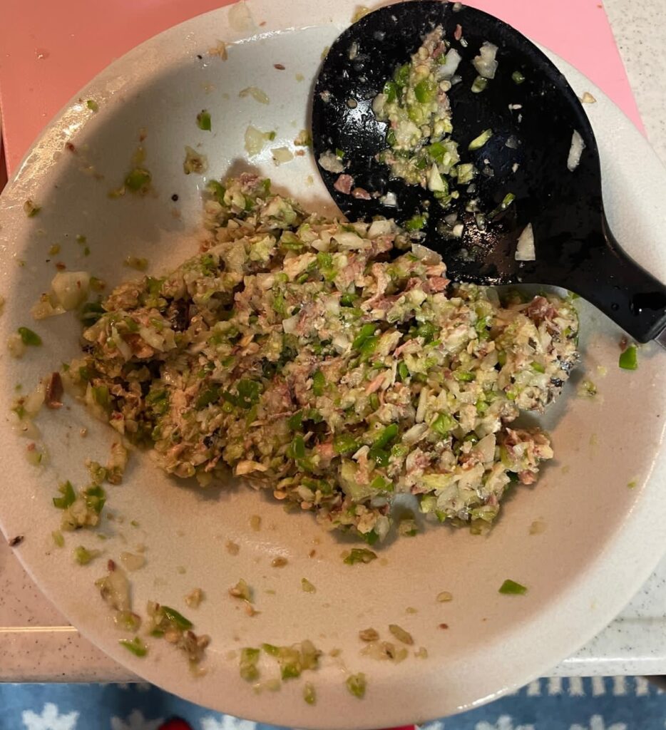 1 玉ねぎや青とうがらし、イワシなどを刻む。