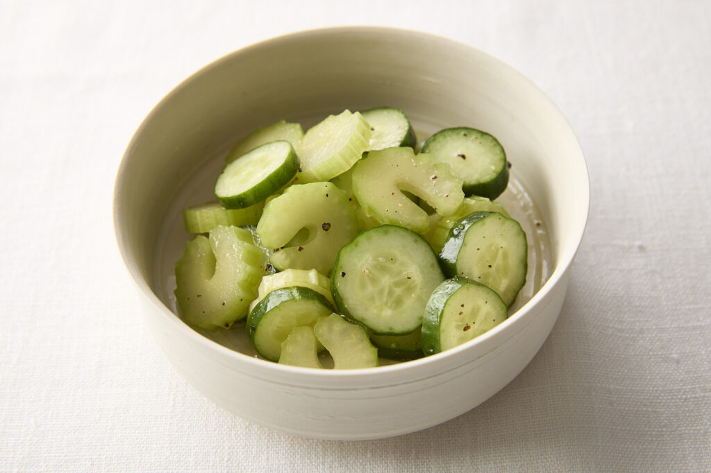 - セロリは筋をとり除き、横5㎜厚さに切る。きゅうりは5㎜厚さの輪切りにする。