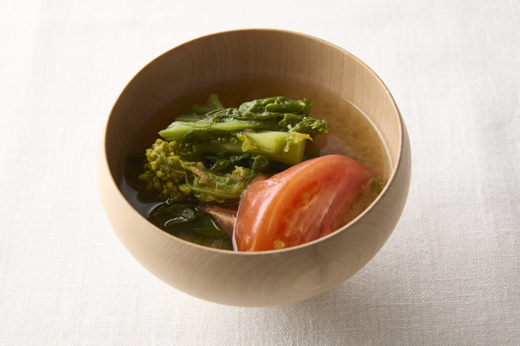 - [汁物]トマトと菜の花のみそ汁