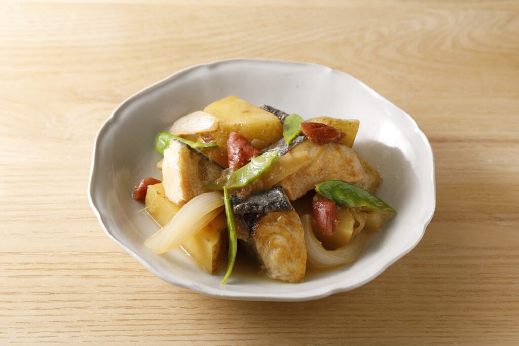 - フライパンにサラダ油を中火で熱し、サワラを入れて両面をさっと焼く。サワラの色が変わったら、aを加えて煮立て、じゃが芋、玉ねぎ、梅干しを加える。弱火にしてふたをし、10分ほど煮る。芋に火が通ったら絹さや、バターを加えてさっと煮る。