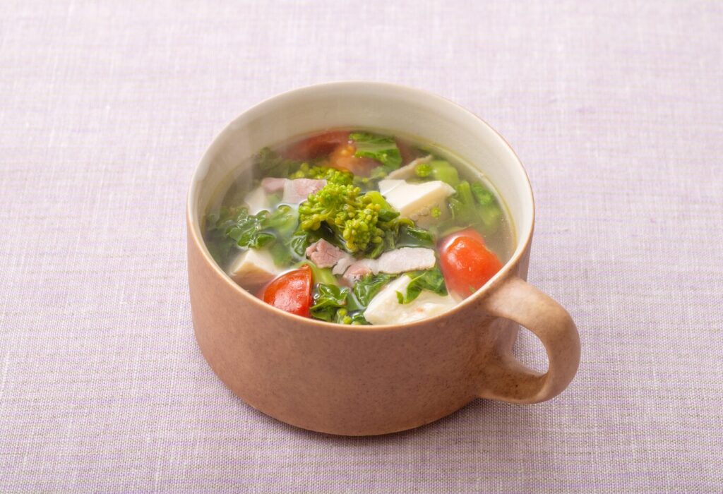 - 分量の水と顆粒ブイヨンを加え、豆腐を手であらくくずして加える。ふたをして、煮立ったら弱火にして5分ほど煮る。塩とこしょうで味をととのえる。
