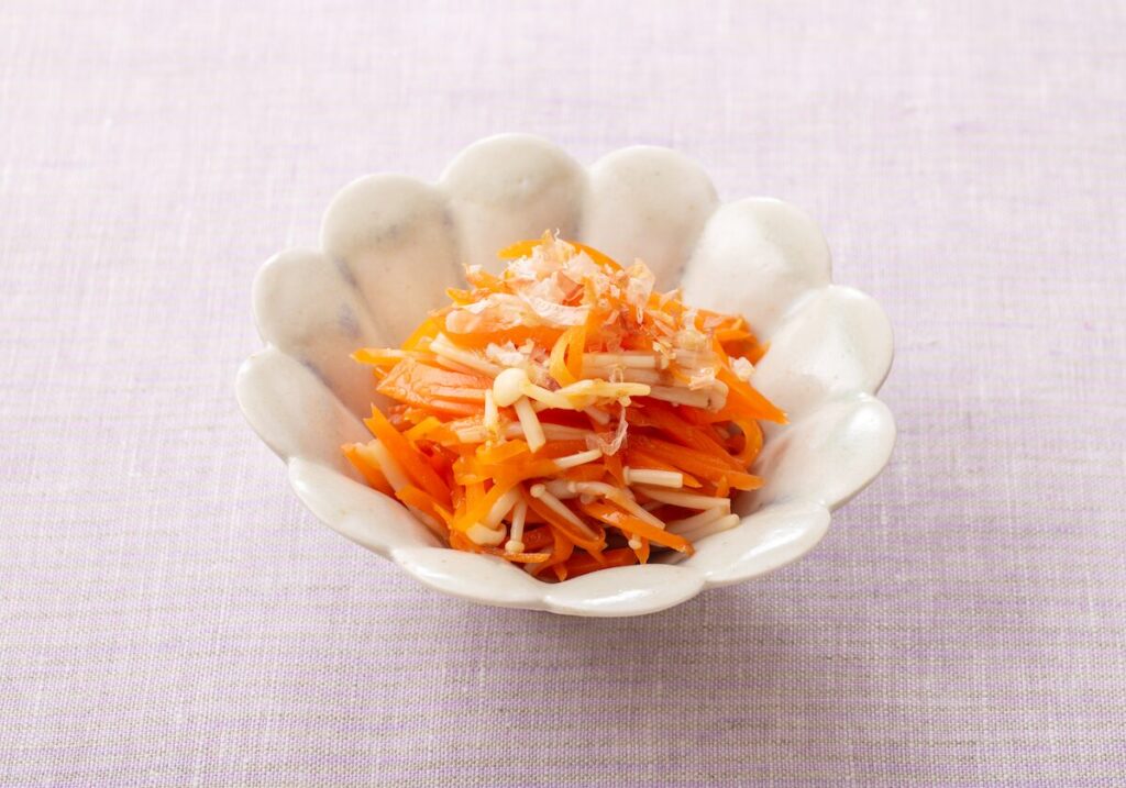 - にんじんは皮をむいてせん切りにする。えのきたけは石づきを除いて長さを4等分に切り、ほぐす。合わせてひと混ぜする。