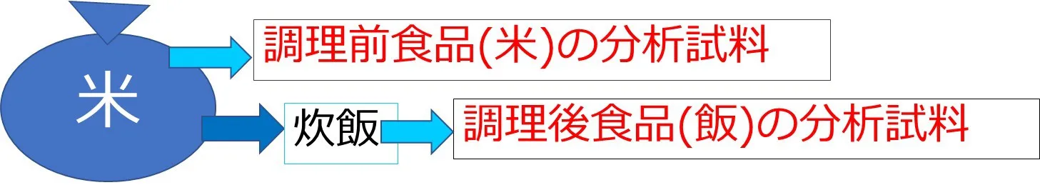四訂成分表以降、成分表2020(八訂)までの成分表では、調理する前の食品と調理後の食品はセットになっています。たとえば、米であれば同じ袋の米の中から一定量の米を「調理する前の食品」として分析し、一定量の米を炊飯し、その「飯(めし)」を「調理した食品」として分析しています(図1)。
