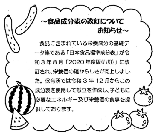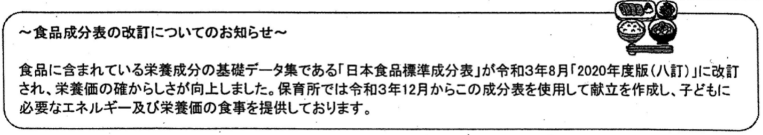 | 読者からの報告 ~仙台市の事例~ エネルギー量についての対応が、教育委員会を巻き込んで進んでいます。管理栄養士である市会議員さんの議会での質問が、下記のような取り組みにつながった仙台市の事例をお知らせいただきましたのでご紹介します。 仙台市教育委員会(小中学校)および仙台市公立保育所で、「食品成分表に係るお知らせ」について、文書発出及び現場への啓発をし、「給食だより」などでのお知らせが進んでいます。公立保育所では7月の献立表(給食だより)で、小中学校においては早ければ8月の夏休み明けにお知らせすることとなります。また、仙台市の保健所からは6月に提出する給食施設状況調査の実施についての5月に出した発文で「栄養管理報告書について、八訂食品成分表で算出したことにより給与栄養量が食事摂取基準と乖離している場合は、備考欄に八訂成分表使用の旨をご記入ください」とお知らせしているそうです。 ![]() ![]() |