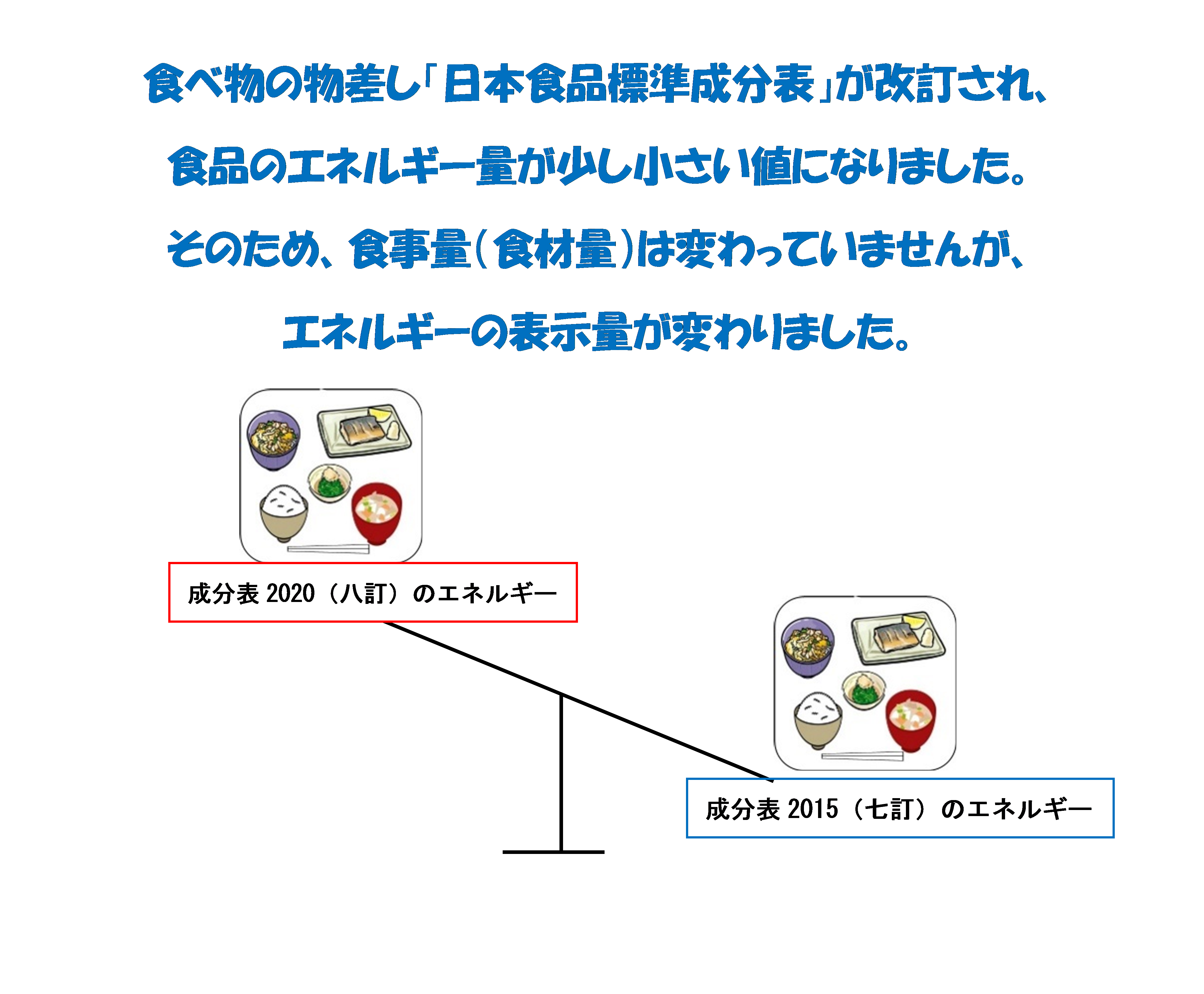ぜひ、いっしょに働く多職種や喫食者に、成分表2020(八訂)のエネルギー量について、お伝えし理解していただくようにしましょう。