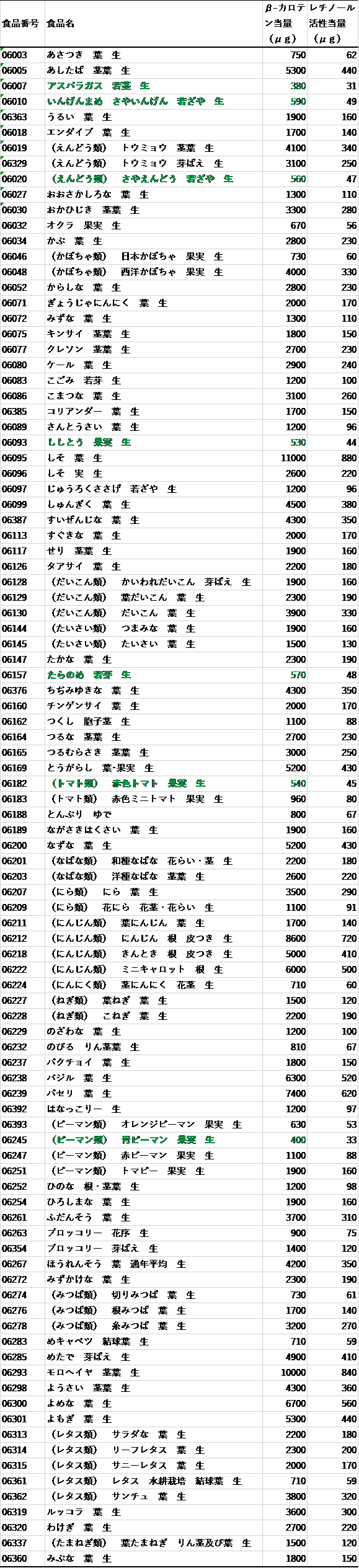 表 緑黄色野菜(食品番号、食品名、β-カロテン(当量)およびレチノール活性当量