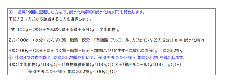 表4に手順を記載しました。計算の手順からも、「差引き法による利用可能炭水化物」(C)が、「炭水化物」(F)に含まれることがわかります。