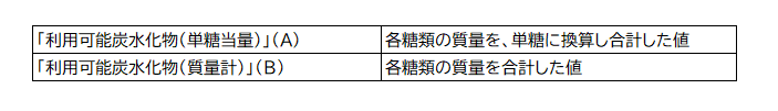 「利用可能炭水化物(単糖当量)」(A)と「利用可能炭水化物(質量計)」(B)は、この各糖類の質量を、異なる方法で示した合計した値です。その方法を表2に示しました。