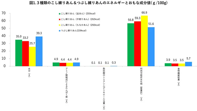 図1に、成分表2020年版(八訂)の4種類のあんこのエネルギーのおもな成分の収載値を示しました。