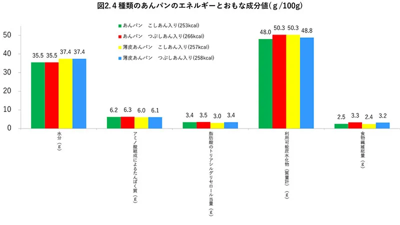 図2に、成分表2020年版(八訂)の4種類のあんパンのエネルギーのおもな成分の収載値を示しました。