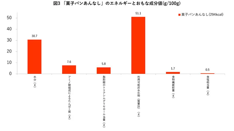 成分表のあんパンの収載値は、あん(「こし練りあん(並あん)」あるいは「つぶしあん」)と、菓子パンあんなし(図3)の配合割合と成分値を用いて計算されています。