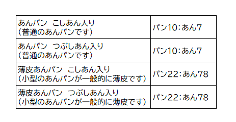 薄皮あんパンでは、パンはあんの、0.28倍量(あんはパンの3.5倍量)です。