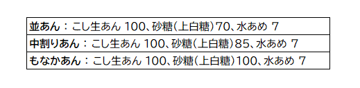「こし練りあん」は、「こし練りあん(並あん)」、「こし練りあん(中割りあん)」および「こし練りあん(もなかあん)」の3種類が、成分表2020年版(八訂)に収載されています。それぞれの 原材料配合割合は以下のとおりです。